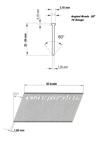 Kolářské hřebíčky Brads kalibr F16 (16 Gauge), páskované pod úhlem 20°