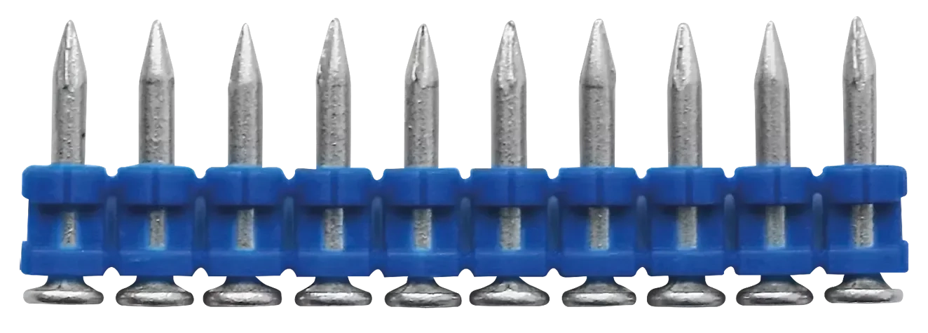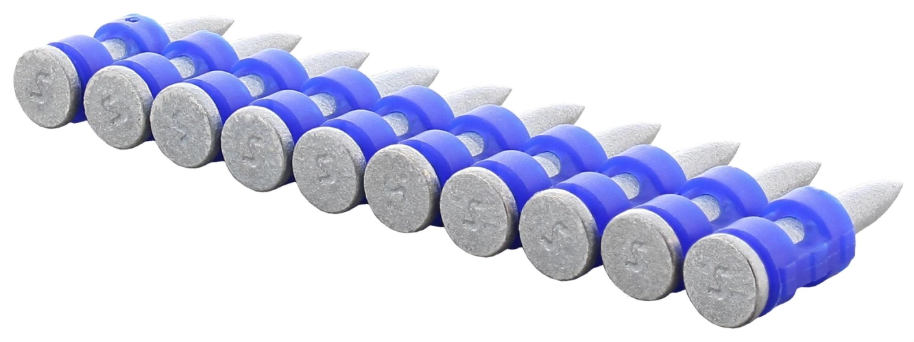 Hřebíky jsou uloženy v modrém plastovém pásu po 15-ti kusech
