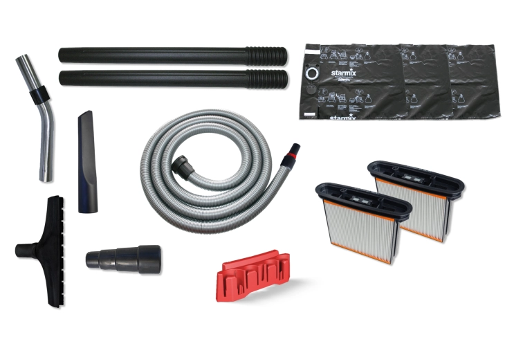 1x sací hadice s červenou NLR, Ø 35 mm x 5 m (č. položky 447193); 2x sací trubice, plastová, Ø 35 mm x 50 cm (č. položky 424859); 1x rukojeť, nerezová ocel, stupňovitá (č. položky 421445); 1x podlahová hubice 30 (č. položky 440941); 1x připojovací hrdlo, stupňovité (č. položky 425719); 1x štěrbinová hubice 22 cm (č. položky 417011) |